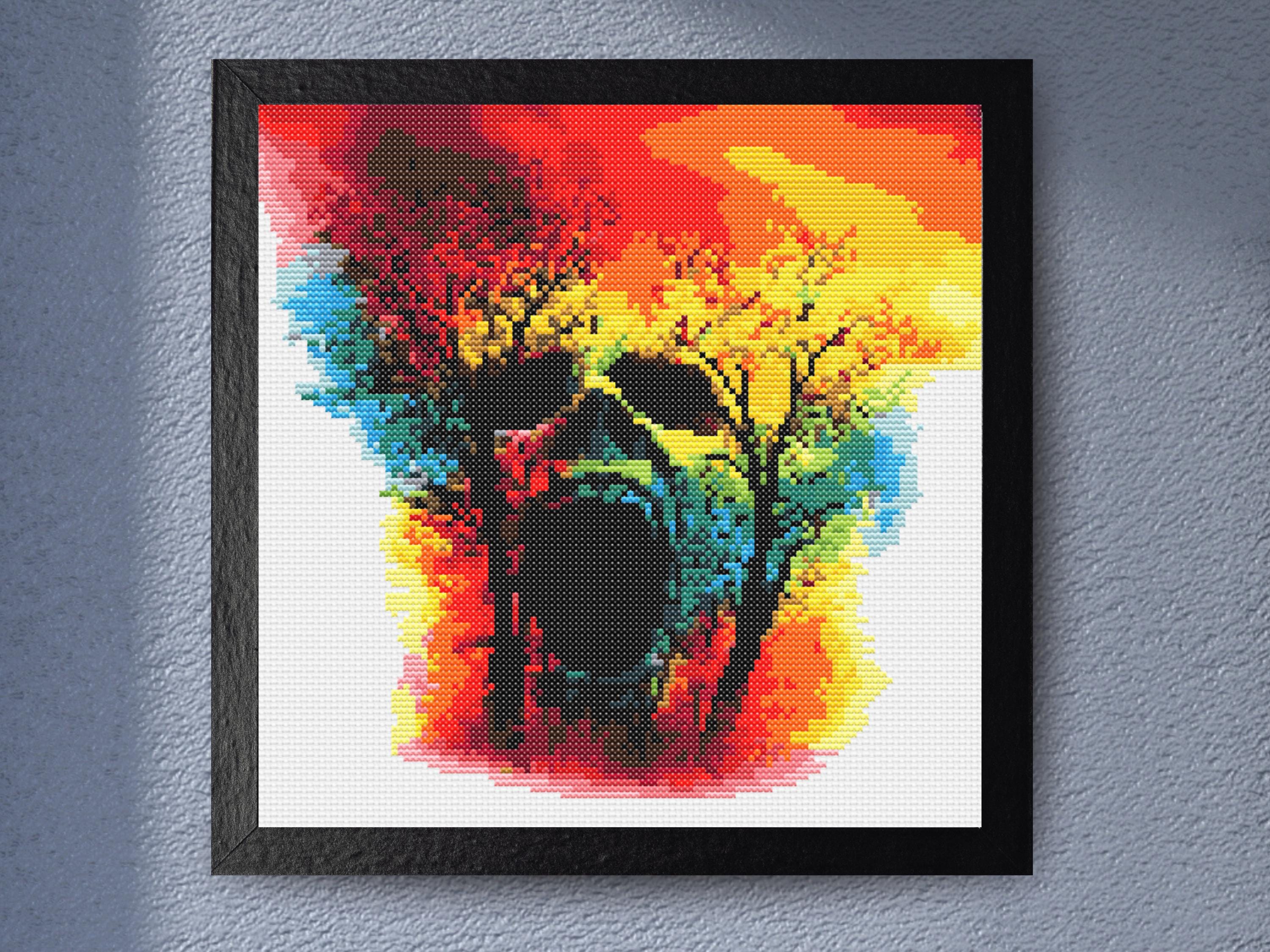 Skull and Trees Cross Stitch Pattern - Neon Fire and Forest Glow Abstract Skull Design for Halloween Decor