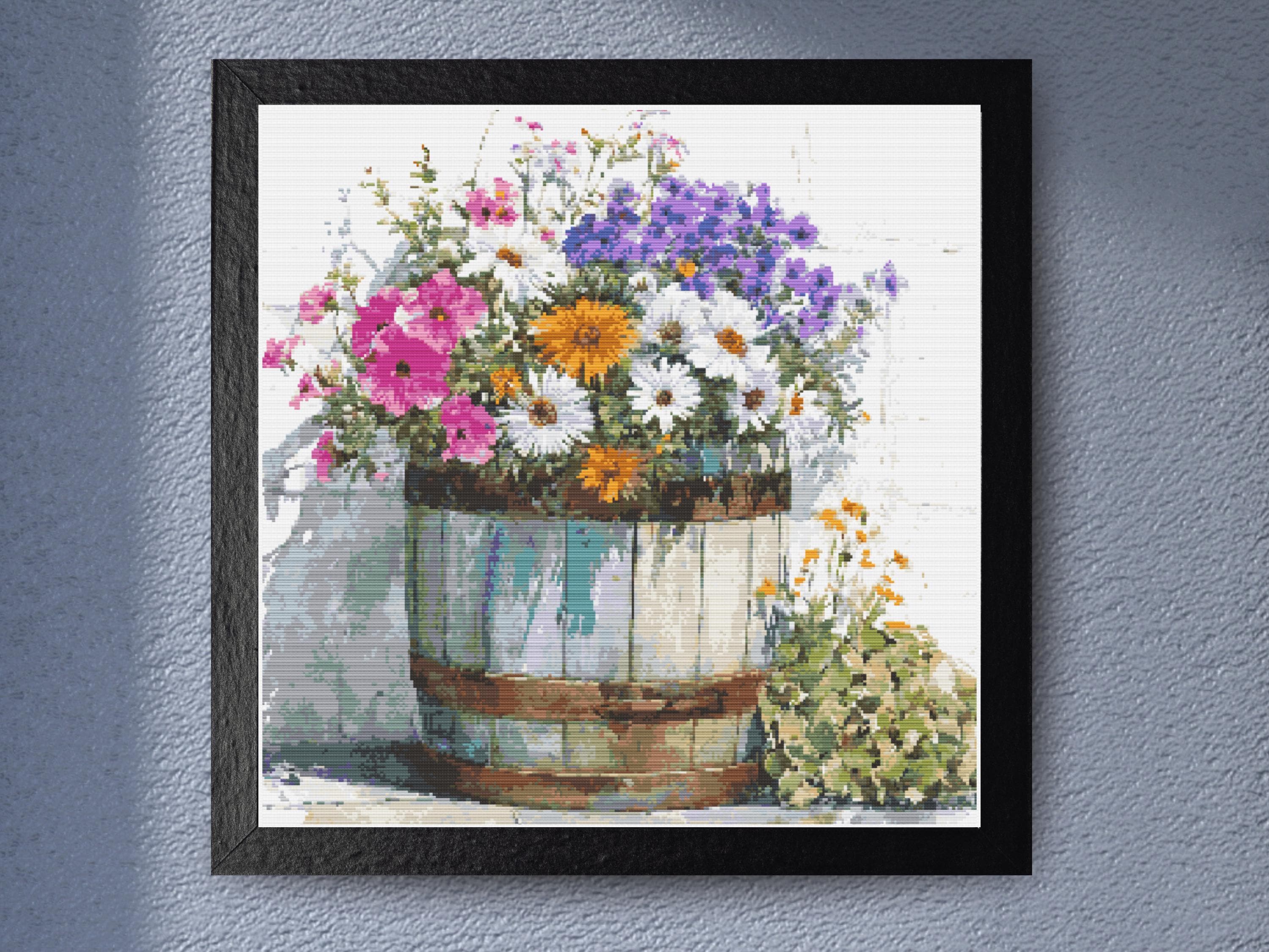 Bring vibrant garden charm into your home with this rustic barrel floral cross stitch pattern. A weathered wooden barrel overflows with daisies, petunias, violets, and other garden blooms in full color. Perfect for nature lovers, this cheerful design brings countryside beauty indoors with rich color and delightful details. Crafted for stitchers who appreciate texture and warmth, this pattern blends bright florals and natural wood tones for a nostalgic, rustic look. Whether you're creating a seasonal piece or year-round decor, this lively bouquet will brighten any space. The detailed petals, shading, and floral variety make this a joy to stitch. Use it to create a beautiful handmade gift or add a splash of floral art to your walls. The included PDF files give you everything you need to begin immediately with clear charting and color coding, suitable for beginners and seasoned stitchers alike. Pattern Details Design Area: 260 x 260 stitches (18.6 x 18.6 inches on 14-count Aida) Actual Number of Cross Stitches: 67,600 Fabric: 14 Count Aida (recommended) but can be stitched on any fabric count of your choice. Just remember to adjust the fabric size and number of threads used accordingly / to your preference. Stitch Types: Full cross stitches only Colors Required: 37 DMC colors Color Palette: Bright florals including vivid purples, fuchsia, tangerine, white, and grassy greens with rustic brown and teal barrel tones What’s Included PDF Full-color chart with DMC color codes PDF Black & white chart with DMC color codes PDF optimized for Pattern Keeper SVG Pattern files in color and black & white Why You’ll Love This Pattern Easy to follow and relaxing to stitch Vibrant floral design with detailed color blending Beautiful as a gift or framed home decor Includes multiple chart options for all preferences Perfect for spring, summer, or rustic cottagecore decor Skill Level Suitable for all skill levels: beginner, intermediate, and advanced Instant Download This cross stitch pattern PDF is available instantly after purchase via download — no physical product will be shipped. Some Common Cross Stitch Terminology Aida – the most popular fabric to use for cross stitch with brands including DMC, Zweigart and Charles Craft. Threads are woven evenly to form squares and the most popular counts are 14 and 16 (see Count below) Back Stitch – a method of stitching to outline a cross stitch piece, usually in a dark colour. Beads – can be stitched onto a project to add depth, colour and detail. Blending – (also called Tweeding) using two or more colours of thread (usually one strand of each) in the same needle at the same time to blend the colours together when stitching. Confetti – single stitches of different colours looking like little confetti being thrown! Chart – the cross stitch pattern to work from when stitching. Count – the number of holes per inch. Often you will hear ’14 count’ meaning 14 holes (or squares) in one inch of the fabric. Counted Cross Stitch – the fabric is plain and you use a printed or digital pattern as a guide to help you place each stitch. DMC – one of the most popular brands of thread (or floss) used for embroidery and cross stitch. It comes in hundreds of different colours and effects. © Copyright littlethingsbyjoe By purchasing this cross stitch pattern you agree to use these patterns solely for your own crafting projects. Any copying, sharing or selling of the digital files is prohibited.