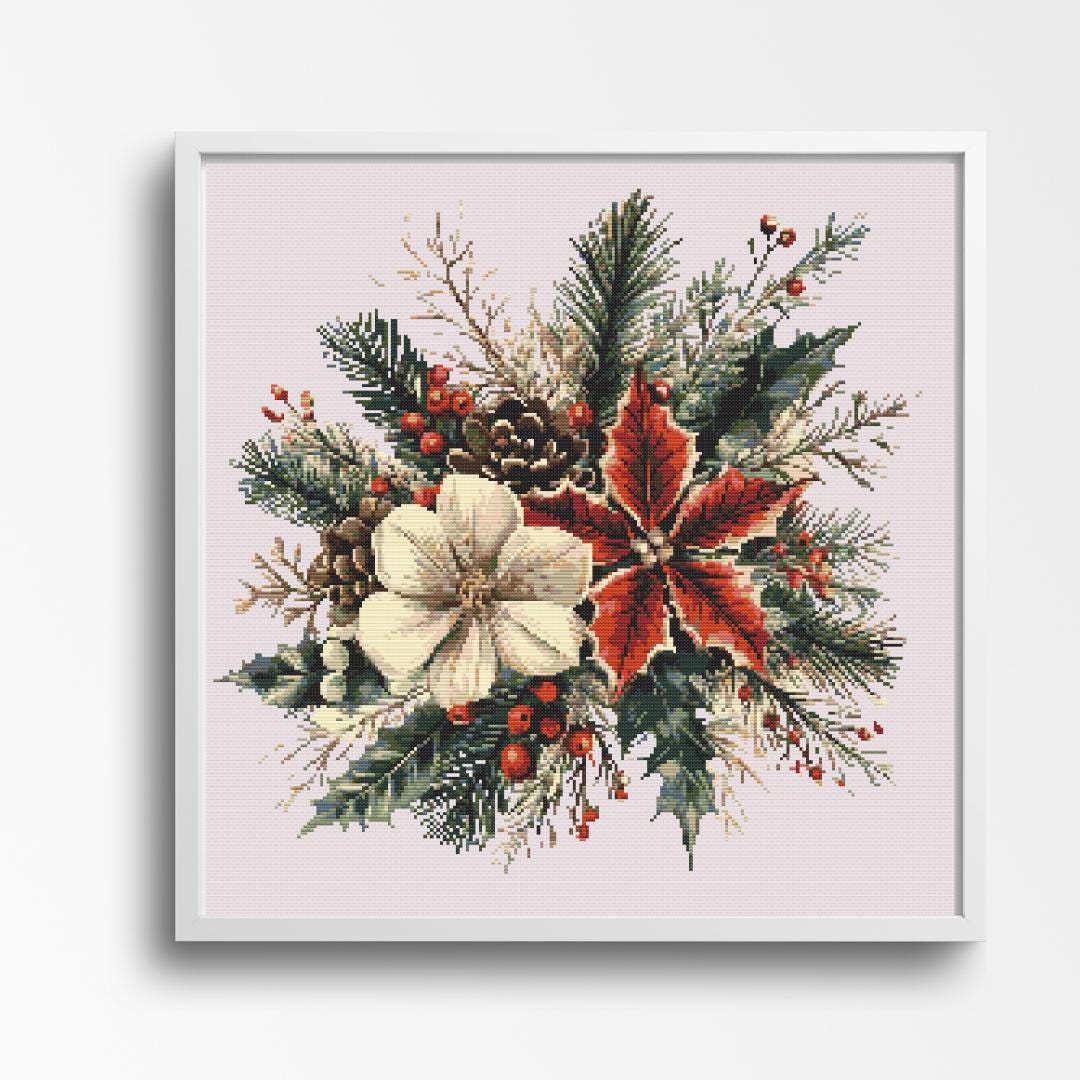 Title: Christmas Bouquet Cross Stitch Pattern - Festive Winter Florals with Poinsettia and Pinecones Description: Celebrate the season with this stunning Christmas bouquet cross-stitch pattern. Featuring a vibrant red poinsettia, elegant white winter bloom, pinecones, holly leaves, and festive berries, this design brings a rich and natural charm to your holiday decor. Perfect for creating a centerpiece-worthy project, it captures the timeless beauty of winter florals and greenery. Pattern Details: Design Area: Approximately 220 x 220 Stitches Fabric: 14 Count Aida - 15.75in x 15.75in stitched image size - 21.75in x 21.75in suggested fabric size Stitches: Full cross stitches, no backstitching or half stitches Colors Required: 22 Colors: A harmonious blend of deep greens, festive reds, and soft neutrals to evoke a classic winter wonderland scene. What's Included: PDF Full-color chart with DMC color codes PDF Black and white chart with DMC color codes PDF File for upload to Pattern Keeper Color SVG Patterns B&W SVG Patterns Why You'll Love This Pattern: A festive and elegant design perfect for holiday stitching projects Adds a timeless seasonal touch to gifts, framed decor, or keepsakes Designed for stitchers of all skill levels to enjoy Skill Level: Suitable for all skill levels, from beginners to advanced stitchers Instant Download: Pattern will be available for instant download upon purchase. SOME COMMON CROSS STITCH TERMINOLOGY Aida โ the most popular fabric to use for cross stitch with brands including DMC, Zweigart and Charles Craft. Threads are woven evenly to form squares and the most popular counts are 14 and 16 (see Count below) Back Stitch โ a method of stitching to outline a cross stitch piece, usually in a dark colour. Beads โ can be stitched onto a project to add depth, colour and detail. Blending โ (also called Tweeding) using two or more colours of thread (usually one strand of each) in the same needle at the same time to blend the colours together when stitching. Confetti โ single stitches of different colours looking like little confetti being thrown! Chart โ the cross stitch pattern to work from when stitching. Count โ the number of holes per inch. Often you will hear โ14 countโ meaning 14 holes (or squares) in one inch of the fabric. Counted Cross Stitch โ the fabric is plain and you use a printed or digital pattern as a guide to help you place each stitch. DMC โ one of the most popular brands of thread (or floss) used for embroidery and cross stitch. It comes in hundreds of different colours and effects.