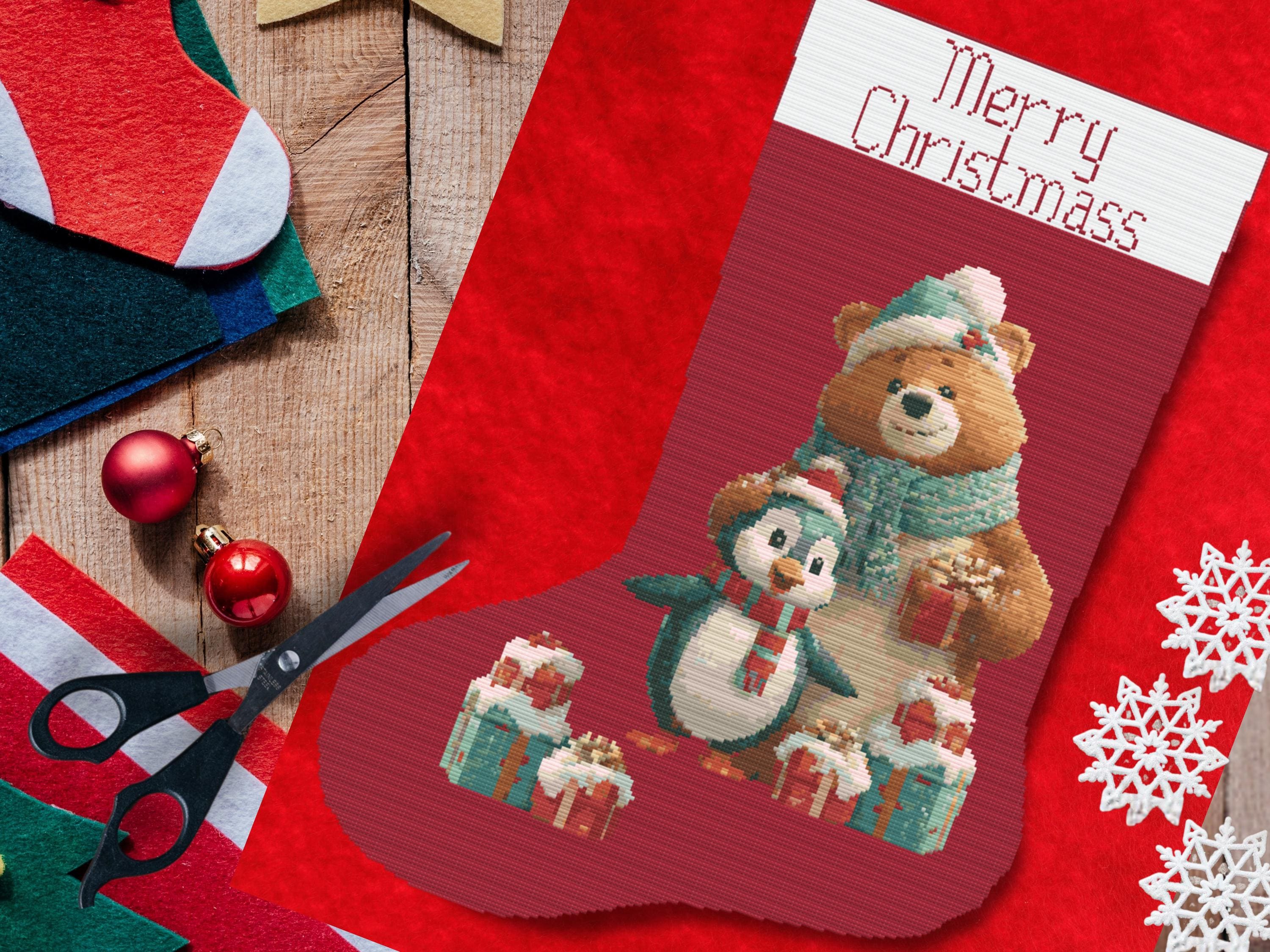 Christmas Stocking 1, Cross Stitch Pattern - Cute Bear and Penguin with PresentsItem #LTJ-1148