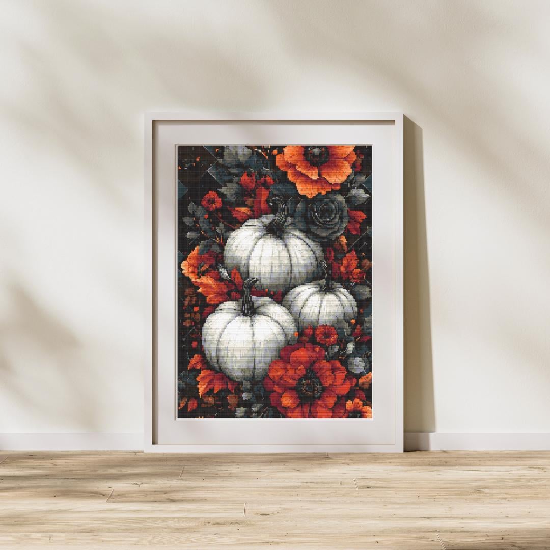 Title: Midnight Bloom: Gothic Pumpkin and Floral Cross Stitch Pattern Description: Celebrate the beauty of autumn with this breathtaking cross-stitch pattern featuring elegant white pumpkins nestled among a vivid arrangement of fall flowers. The contrasting colors of soft, pale pumpkins against the deep orange and burnt reds of poppies and other seasonal blooms create a striking visual that captures the essence of the harvest season. The dark, muted foliage adds depth and drama to the scene, making this design a perfect addition to your autumn decor. Stitch this richly detailed pattern to bring a cozy and vibrant fall aesthetic into your home, or gift it to someone who loves the warmth and charm of the season. Pattern Details: Design Area: Approximately 168 x 300 stitches 2 over 1 Fabric: Recommended on 14-count Aida cloth Stitches: Full cross stitches, no backstitching or half stitches Colors: A bold autumn palette with deep oranges, warm reds, and soft whites against a dramatic dark background. What's Included: PDF Full-color, easy-to-follow charts with DMC color codes for a vivid and accurate palette PDF Black and white, easy-to-follow charts with DMC color codes PDF File for upload to Pattern Keeper Color SVG Patterns B&W SVG Patterns Why You'll Love This Pattern: Rich Autumn Aesthetic: The combination of white pumpkins and vibrant fall flowers makes this pattern a stunning piece for seasonal decor. Seasonal Home Decor: Perfect for adding warmth and color to your fall-themed spaces. Relaxing Hobby: Immerse yourself in the calming process of stitching while watching the colors of fall come to life. Gift Idea: A thoughtful and unique handmade gift for autumn lovers or anyone who enjoys seasonal crafts. Skill Level: Suitable for all skill levels, from beginners to advanced stitchers. Instant Download: After purchase, you will receive a link to download the PDF pattern instantly. No waiting—start your project right away! SOME COMMON CROSS STITCH TERMINOLOGY Aida – the most popular fabric to use for cross stitch with brands including DMC, Zweigart and Charles Craft. Threads are woven evenly to form squares and the most popular counts are 14 and 16 (see Count below) Back Stitch – a method of stitching to outline a cross stitch piece, usually in a dark colour. Beads – can be stitched onto a project to add depth, colour and detail. Blending – (also called Tweeding) using two or more colours of thread (usually one strand of each) in the same needle at the same time to blend the colours together when stitching. Confetti – single stitches of different colours looking like little confetti being thrown! Chart – the cross stitch pattern to work from when stitching. Count – the number of holes per inch. Often you will hear ’14 count’ meaning 14 holes (or squares) in one inch of the fabric. Counted Cross Stitch – the fabric is plain and you use a printed or digital pattern as a guide to help you place each stitch. DMC – one of the most popular brands of thread (or floss) used for embroidery and cross stitch. It comes in hundreds of different colours and effects.