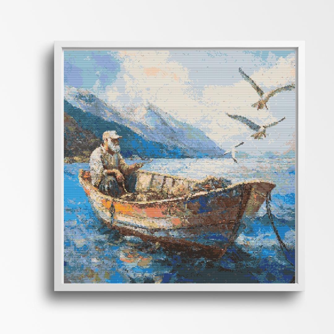 Title: Fisherman in a Boat Cross Stitch Pattern - Peaceful Coastal Scene with Seagulls Description: A tranquil portrayal of a fisherman resting in his weathered boat, surrounded by calm blue waters and soaring seagulls. The stunning mountain backdrop and serene skies add depth and beauty to this peaceful coastal scene, perfect for maritime lovers. Pattern Details: • Design Area: 300 x 300 Stitches • Fabric: 14 Count Aida - 21.5 x 21.5 Stitched Image Size • Stitches: Full cross stitches only; no backstitching or half stitches required • Colors Required: 30 • Colors: A soothing palette of ocean blues, earthy browns, and crisp whites, evoking the serenity of life on the water. What's Included: • PDF Full-color chart with DMC color codes • PDF Black and white chart with DMC color codes • PDF File for upload to Pattern Keeper • Color SVG Patterns • B&W SVG Patterns Why You'll Love This Pattern: • Perfect for nautical and coastal-themed decor • A meditative and detailed project for experienced stitchers • Captures the peaceful beauty of a seafaring lifestyle Skill Level: • Suitable for all skill levels, from beginners to advanced stitchers Instant Download: • Pattern will be available for instant download upon purchase. SOME COMMON CROSS STITCH TERMINOLOGY Aida – the most popular fabric to use for cross stitch with brands including DMC, Zweigart and Charles Craft. Threads are woven evenly to form squares and the most popular counts are 14 and 16 (see Count below) Back Stitch – a method of stitching to outline a cross stitch piece, usually in a dark colour. Beads – can be stitched onto a project to add depth, colour and detail. Blending – (also called Tweeding) using two or more colours of thread (usually one strand of each) in the same needle at the same time to blend the colours together when stitching. Confetti – single stitches of different colours looking like little confetti being thrown! Chart – the cross stitch pattern to work from when stitching. Count – the number of holes per inch. Often you will hear ’14 count’ meaning 14 holes (or squares) in one inch of the fabric. Counted Cross Stitch – the fabric is plain and you use a printed or digital pattern as a guide to help you place each stitch. DMC – one of the most popular brands of thread (or floss) used for embroidery and cross stitch. It comes in hundreds of different colours and effects. © 2025 littlethingsbyjoe by Jolene Underwood