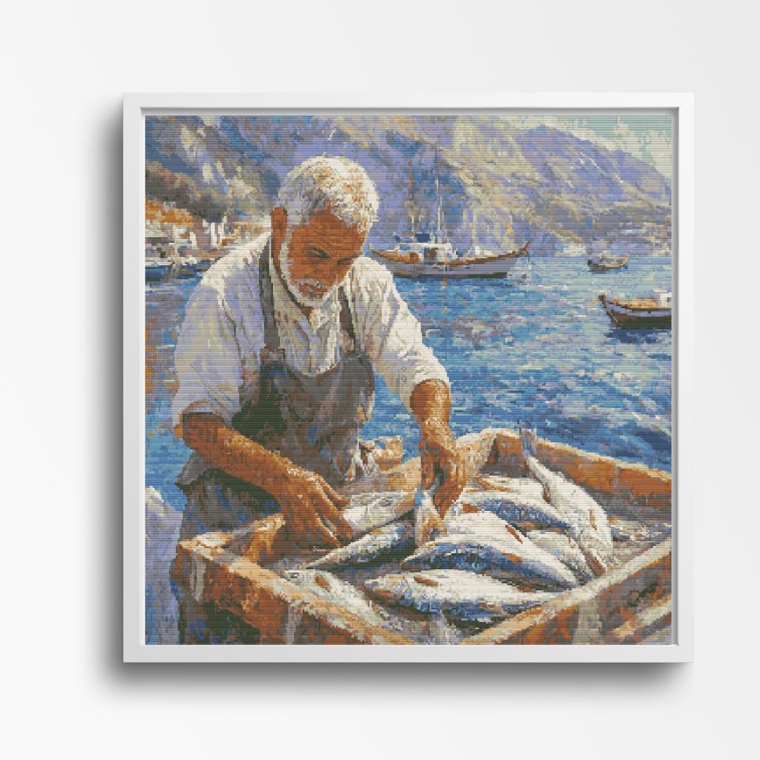 Title: Fisherman Cross Stitch Pattern - Rustic Coastal Scene of Daily Life Description: A serene depiction of a seasoned fisherman tending to his fresh catch by the harbor. The scene captures the essence of coastal life, with vibrant blue waters, distant boats, and rugged mountains in the background. This pattern evokes a sense of peace and timeless tradition. Pattern Details: • Design Area: 300 x 300 Stitches • Fabric: 14 Count Aida - 21.5 x 21.5 Stitched Image Size • Stitches: Full cross stitches only; no backstitching or half stitches required • Colors Required: 30 • Colors: A rich blend of ocean blues, warm earth tones, and soft neutrals that bring this rustic coastal scene to life. What's Included: • PDF Full-color chart with DMC color codes • PDF Black and white chart with DMC color codes • PDF File for upload to Pattern Keeper • Color SVG Patterns • B&W SVG Patterns Why You'll Love This Pattern: • Captures the charm of coastal living and hard work • A perfect project for nautical or rustic home decor • Relaxing and detailed design for avid stitchers Skill Level: • Suitable for all skill levels, from beginners to advanced stitchers Instant Download: • Pattern will be available for instant download upon purchase. SOME COMMON CROSS STITCH TERMINOLOGY Aida – the most popular fabric to use for cross stitch with brands including DMC, Zweigart and Charles Craft. Threads are woven evenly to form squares and the most popular counts are 14 and 16 (see Count below) Back Stitch – a method of stitching to outline a cross stitch piece, usually in a dark colour. Beads – can be stitched onto a project to add depth, colour and detail. Blending – (also called Tweeding) using two or more colours of thread (usually one strand of each) in the same needle at the same time to blend the colours together when stitching. Confetti – single stitches of different colours looking like little confetti being thrown! Chart – the cross stitch pattern to work from when stitching. Count – the number of holes per inch. Often you will hear ’14 count’ meaning 14 holes (or squares) in one inch of the fabric. Counted Cross Stitch – the fabric is plain and you use a printed or digital pattern as a guide to help you place each stitch. DMC – one of the most popular brands of thread (or floss) used for embroidery and cross stitch. It comes in hundreds of different colours and effects. © 2025 littlethingsbyjoe by Jolene Underwood