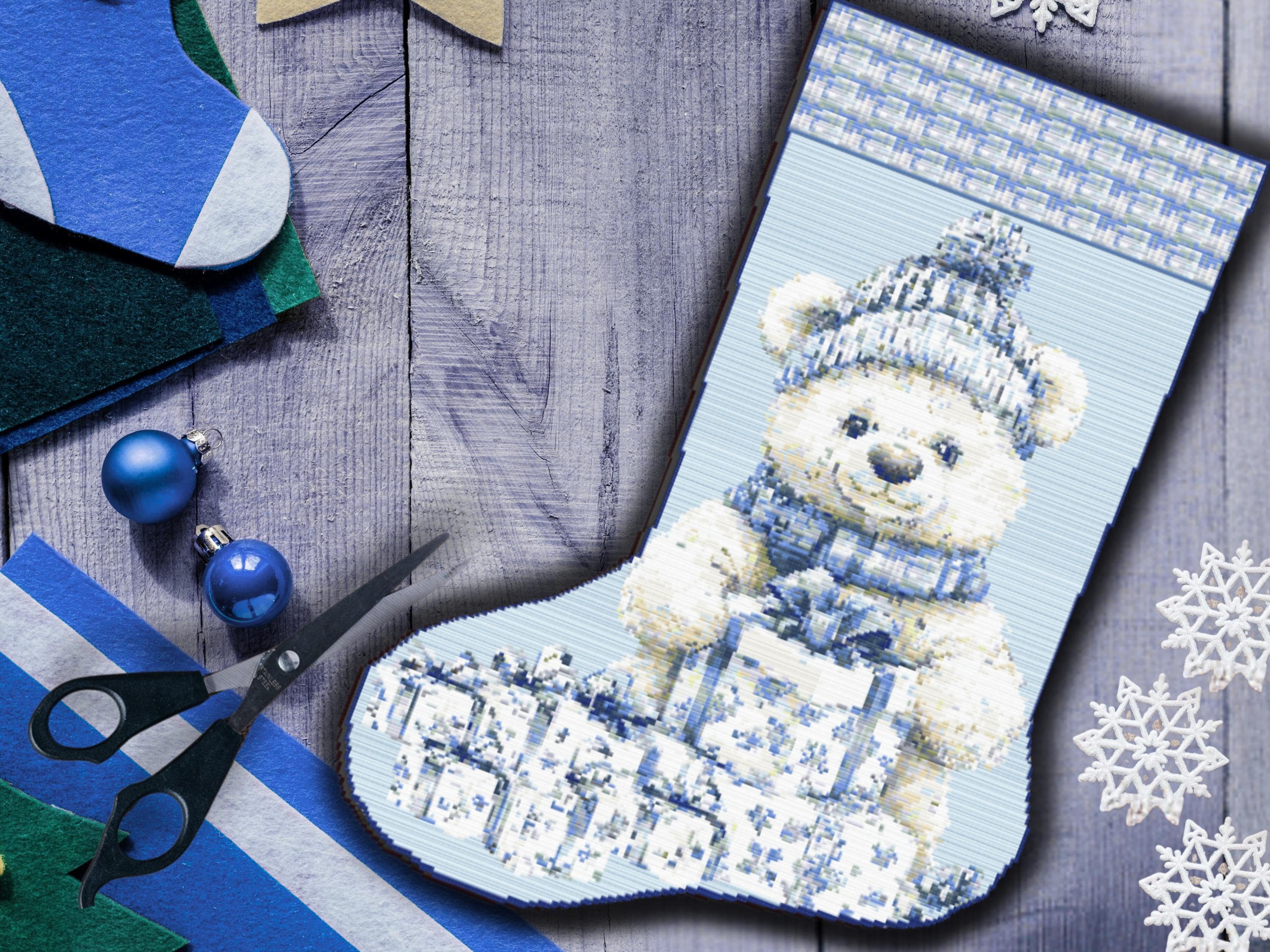 Christmas Stocking Cross Stitch Pattern - Blue Teddy Bear with Gifts - Holiday Decor, Beginner Friendly, Personalized Gift Idea This cozy teddy bear Christmas stocking features a cream-colored bear dressed in blue plaid winterwear, surrounded by gift boxes in soft vintage blues. The delicate details, wrapping, and gentle shading create a peaceful, cottagecore-inspired design perfect for holiday decor or heirloom gifting. With its warm, handmade charm, this stocking is ideal for personalizing Christmas celebrations and makes a heartfelt keepsake for years to come. Celebrate the festive season with this charming Christmas cross stitch pattern, featuring an adorable teddy bear in cozy winter gear surrounded by beautifully wrapped blue floral presents. Designed in soft icy blues and whites, this pattern evokes a calm, nostalgic winter wonderland perfect for any holiday decor. The generous size and bold lines make it an ideal project for beginners as well as seasoned stitchers. Perfect for creating personalized Christmas stockings, this design also makes a thoughtful handmade gift. Whether you’re crafting for a baby’s first Christmas or creating festive family keepsakes, this design brings joy and coziness into your holiday stitching. Pattern Details: - Design Area: Approximately 190 x 270 stitches (13.6 x 19.3 inches on 14-count Aida) - Actual Number of Cross Stitches: 32,460 - Fabric: 14 Count Aida (recommended) - Stitch Types: Full cross stitches only (no backstitching or half stitches) - Colors Required: 25 DMC colors - Color Palette: A wintry blend of icy blues, snowy whites, and soft grays adds a gentle, classic holiday tone What's Included: - PDF Full-color chart with DMC color codes - PDF Black & white chart with DMC color codes - PDF optimized for Pattern Keeper - SVG Pattern files in color and black & white Why You'll Love This Pattern: - Easy-to-read layout with clean symbols - Suitable for personalizing Christmas stockings - Thoughtful gift idea for children, grandchildren, or festive home decor - Ideal for holiday craft fairs or handmade gift swaps Skill Level: - Suitable for all skill levels: beginner, intermediate, and advanced Instant Download: - Cross stitch pattern PDF available instantly after purchase—no physical shipping required SOME COMMON CROSS STITCH TERMINOLOGY Aida – the most popular fabric to use for cross stitch with brands including DMC, Zweigart and Charles Craft. Threads are woven evenly to form squares and the most popular counts are 14 and 16 (see Count below) Back Stitch – a method of stitching to outline a cross stitch piece, usually in a dark colour. Beads – can be stitched onto a project to add depth, colour and detail. Blending – (also called Tweeding) using two or more colours of thread (usually one strand of each) in the same needle at the same time to blend the colours together when stitching. Confetti – single stitches of different colours looking like little confetti being thrown! Chart – the cross stitch pattern to work from when stitching. Count – the number of holes per inch. Often you will hear ’14 count’ meaning 14 holes (or squares) in one inch of the fabric. Counted Cross Stitch – the fabric is plain and you use a printed or digital pattern as a guide to help you place each stitch. DMC – one of the most popular brands of thread (or floss) used for embroidery and cross stitch. It comes in hundreds of different colours and effects. ©2025 Copyright littlethingsbyjoe
