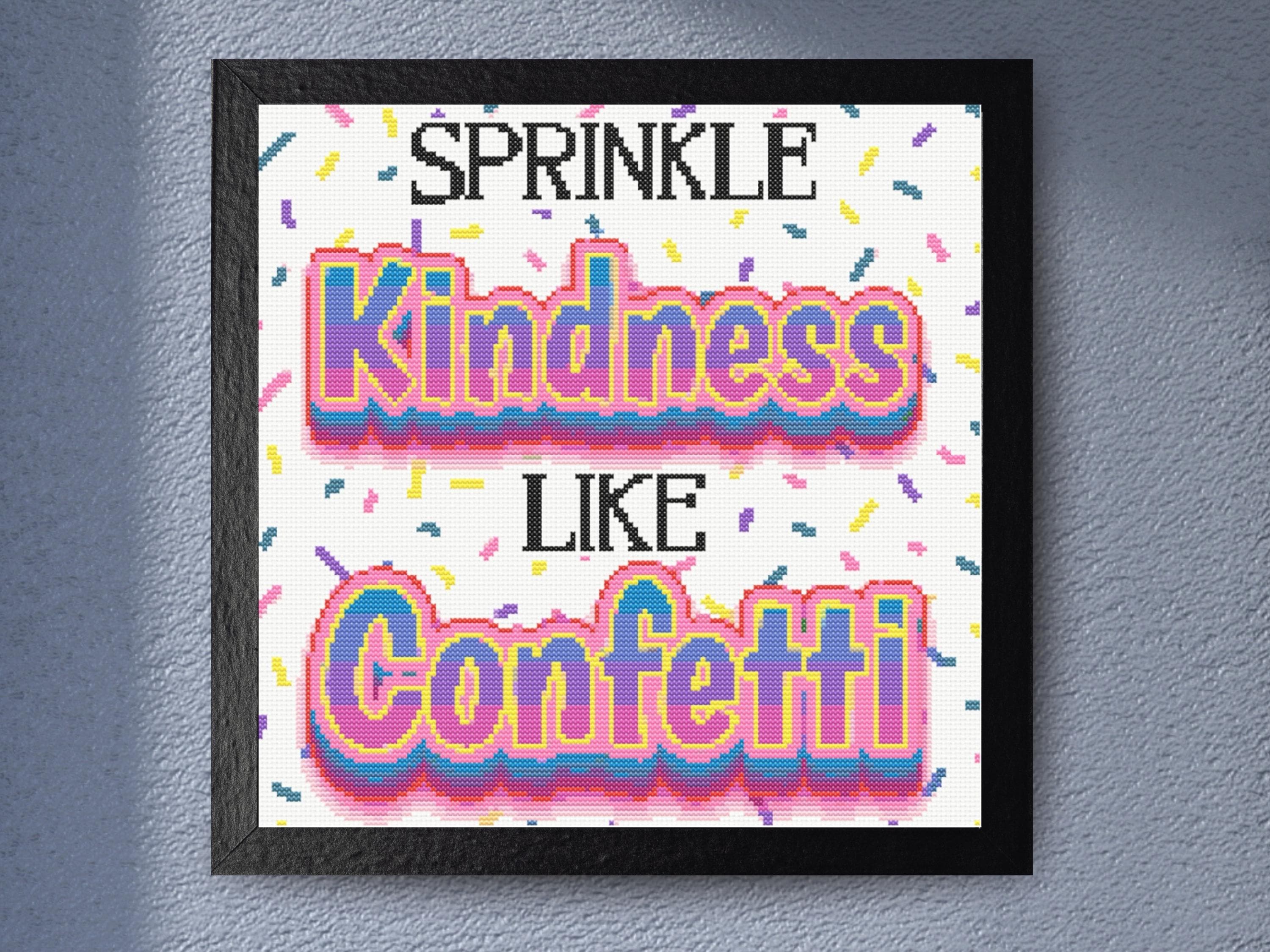 Title: Sprinkle Kindness Cross Stitch Pattern - Bright Confetti Quote in Rainbow Colors, Fun Uplifting Embroidery Design, Beginner Friendly Gift Description: Spread a little joy and stitch some sunshine with this Sprinkle Kindness Like Confetti Cross Stitch Pattern! Featuring bold, bubbly lettering in vibrant rainbow shades with playful confetti scattered all around, this design is an instant mood-lifter. It’s the perfect message for a creative space, classroom, therapy office, or anywhere that could use a splash of positivity and color. With the word Kindness framed in layered rainbow lettering and Confetti in a festive explosion of color, this feel-good quote is perfect for gifting to someone special or for decorating your own happy space. Designed with only full cross stitches and a clear layout, it’s both fun and beginner-friendly, while still satisfying for seasoned stitchers who love vibrant results. A bright and thoughtful project, this pattern is as uplifting to stitch as it is to admire! Pattern Details: Design Area: Approximately 150 x 150 stitches Actual Number of Cross Stitches: 14,285 Fabric: 14 Count Aida (recommended) Stitch Types: Full cross stitches only (no backstitching or half stitches) Colors Required: 17 DMC colors Color Palette: Cheerful mix of pinks, yellows, blues, purples, oranges, and soft pastels with bold black for text contrast—just like real confetti! What's Included: PDF Full-color chart with DMC color codes PDF Black & white chart with DMC color codes PDF optimized for Pattern Keeper SVG Pattern files in color and black & white Why You'll Love This Pattern: Encouraging quote perfect for gifting or personal motivation Bright colors and clean layout for an eye-catching finish A joyful project that’s quick to complete and easy to display Skill Level: Suitable for all skill levels: beginner, intermediate, and advanced Instant Download: This is a digital download. Your files will be available instantly after purchase—no waiting, just download, print, and start stitching! THE TOP CROSS STITCH TERMS YOU NEED TO KNOW Aida – the most popular fabric to use for cross stitch with brands including DMC, Zweigart and Charles Craft. Threads are woven evenly to form squares and the most popular counts are 14 and 16 (see Count below) Back Stitch – a method of stitching to outline a cross stitch piece, usually in a dark colour. Beads – can be stitched onto a project to add depth, colour and detail. Blending – (also called Tweeding) using two or more colours of thread (usually one strand of each) in the same needle at the same time to blend the colours together when stitching. Confetti – single stitches of different colours looking like little confetti being thrown! Chart – the cross stitch pattern to work from when stitching. Count – the number of holes per inch. Often you will hear ’14 count’ meaning 14 holes (or squares) in one inch of the fabric. Counted Cross Stitch – the fabric is plain and you use a printed or digital pattern as a guide to help you place each stitch. DMC – one of the most popular brands of thread (or floss) used for embroidery and cross stitch. It comes in hundreds of different colours and effects.
