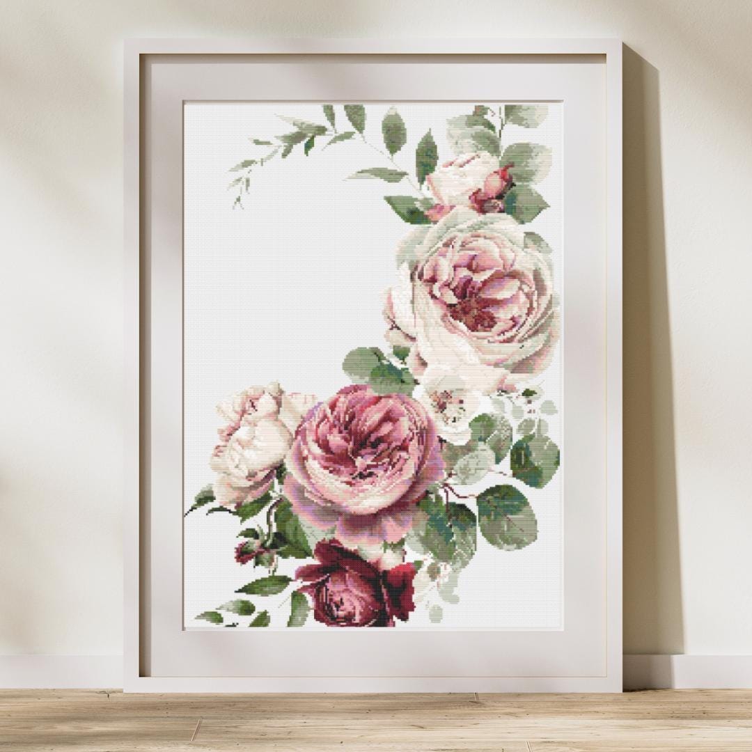 Title: "Elegant Floral Cross Stitch Pattern - Romantic Roses and Greenery" Description: Elegant Floral Cross Stitch Pattern - Romantic Roses and Greenery Immerse yourself in the timeless beauty of nature with this "Elegant Floral Cross Stitch Pattern." Featuring a stunning bouquet of romantic roses intertwined with soft greenery, this design exudes elegance and sophistication. Ideal for floral enthusiasts and those who love delicate, intricate designs, this piece adds a touch of refinement to any room. Pattern Details: Design Area: Approximately 200 x 300 Stitches Fabric: Recommended on 14-count Aida cloth Stitches: Full cross stitches, no backstitching or half stitches Colors: A soft and romantic palette of blush, burgundy, and green tones What's Included: Your digital download will include a PDF file with links to the following easy-to-follow charts for beginners and advanced stitchers: PDF Full-color, easy-to-follow charts with DMC color codes for a vivid and accurate palette PDF Black and white, easy-to-follow charts with DMC color codes PDF File for upload to Pattern Keeper Colour SVG Patterns B&W SVG Patterns Why You'll Love This Pattern: Detailed Design: High-quality pattern with clear symbols and detailed instructions Relaxing Hobby: Offers hours of relaxing and enjoyable stitching Home Decor: Finished piece makes an elegant addition to any home decor, especially in a living room or bedroom Gift Idea: Ideal for gifting to friends and family who appreciate nature, floral art, or DIY crafts Skill Level: Suitable for all skill levels, from beginners to advanced stitchers. Instant Download: After purchase, you will receive a link to download the PDF pattern instantly. No waiting—start your project right away! SOME COMMON CROSS STITCH TERMINOLOGY Aida – the most popular fabric to use for cross stitch with brands including DMC, Zweigart and Charles Craft. Threads are woven evenly to form squares and the most popular counts are 14 and 16 (see Count below) Back Stitch – a method of stitching to outline a cross stitch piece, usually in a dark colour. Beads – can be stitched onto a project to add depth, colour and detail. Blending – (also called Tweeding) using two or more colours of thread (usually one strand of each) in the same needle at the same time to blend the colours together when stitching. Confetti – single stitches of different colours looking like little confetti being thrown! Chart – the cross stitch pattern to work from when stitching. Count – the number of holes per inch. Often you will hear ’14 count’ meaning 14 holes (or squares) in one inch of the fabric. Counted Cross Stitch – the fabric is plain and you use a printed or digital pattern as a guide to help you place each stitch. DMC – one of the most popular brands of thread (or floss) used for embroidery and cross stitch. It comes in hundreds of different colours and effects.