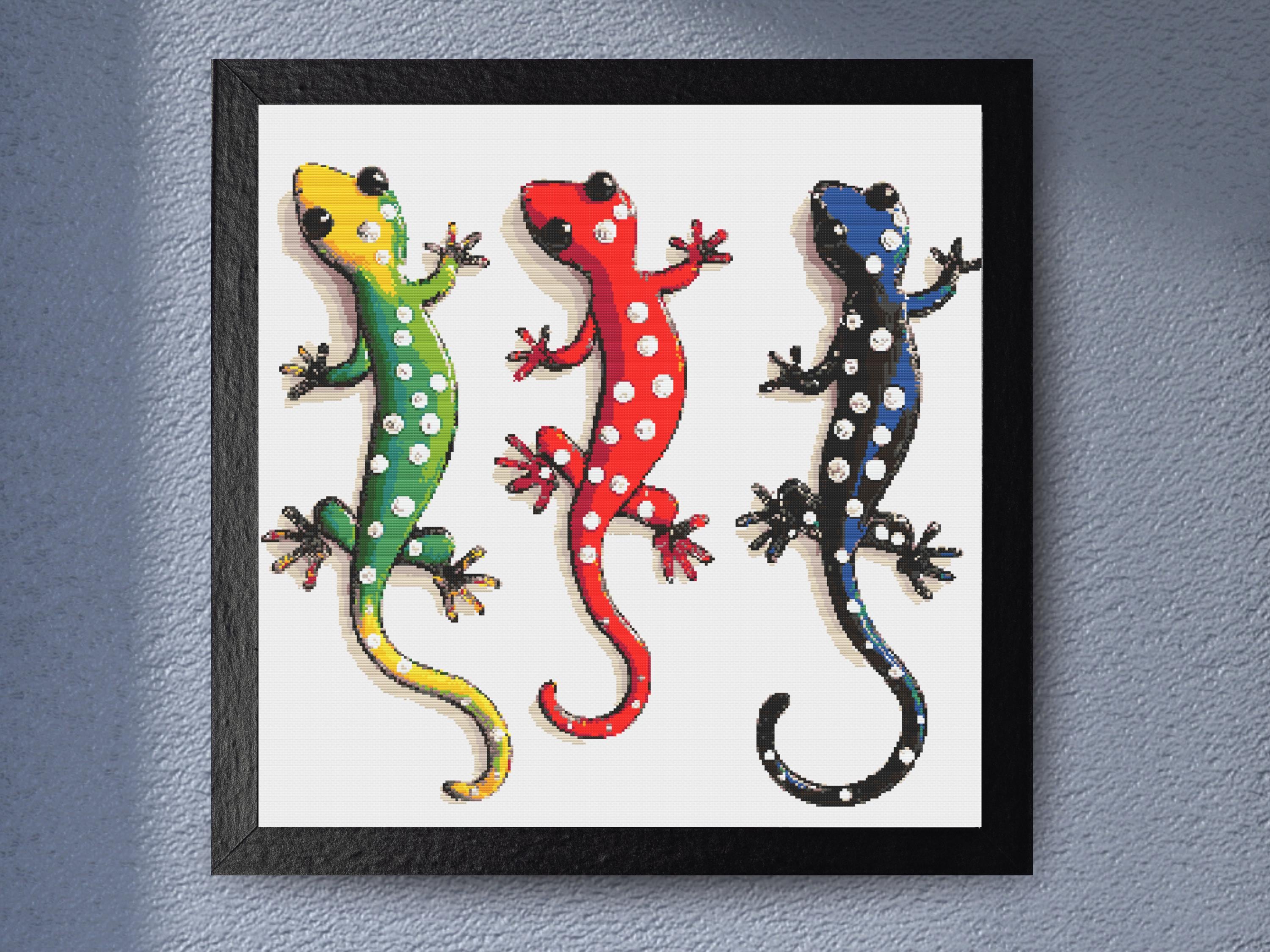Polka Dot Geckos Cross Stitch Pattern β Colorful Lizard Wall Art for Kids Rooms and Animal Lovers Bring vibrant whimsy to your stitching with this polka dot geckos cross stitch pattern! Featuring three playful lizards in bold red, green, and blue, each with funky white polka dots and glossy, high-shine detailing, this design is full of energy and color. Whether youβre decorating a nursery, crafting for a reptile enthusiast, or just love unique animal patterns, this bright and cheerful gecko trio will add a splash of fun to your stitching collection. Pattern Details: Design Area: Approximately 300 x 300 Stitches Fabric: Recommended on 14-count Aida cloth Stitches: Full cross stitches, no backstitching or half stitches Colors: A bright and energetic palette of lime green, firetruck red, cobalt blue, jet black, and crisp white, accented with subtle shadowing for a bold 3D effect Number of Colors: 20 What's Included: β PDF Full-color pattern with clear symbols and DMC color codes β PDF Black and white pattern for easy printing β Pattern Keeper-compatible PDF file for digital stitching β Color SVG Pattern for enhanced clarity β Black & White SVG Pattern for alternate stitching guides Why You'll Love This Pattern: β Perfect for Kidsβ Rooms & Playful Decor β A fun, colorful lizard trio that adds personality to any space β Great for Reptile Lovers β A creative and unique gift for gecko fans and herpetologists alike β Bold & Easy to Read β High-contrast designs and simple shapes make this an enjoyable stitch β Fun Weekend Project β Great for quick stitching sessions or to brighten your pattern library β Instant Download β Get your pattern right away and start stitching today! Skill Level: Suitable for all skill levels, from beginners to advanced stitchers. Instant Download: Your pattern will be available for instant download upon purchase. THE TOP CROSS STITCH TERMS YOU NEED TO KNOW Aida β the most popular fabric to use for cross stitch with brands including DMC, Zweigart and Charles Craft. Threads are woven evenly to form squares and the most popular counts are 14 and 16 (see Count below) Back Stitch β a method of stitching to outline a cross stitch piece, usually in a dark colour. Beads β can be stitched onto a project to add depth, colour and detail. Blending β (also called Tweeding) using two or more colours of thread (usually one strand of each) in the same needle at the same time to blend the colours together when stitching. Confetti β single stitches of different colours looking like little confetti being thrown! Chart β the cross stitch pattern to work from when stitching. Count β the number of holes per inch. Often you will hear β14 countβ meaning 14 holes (or squares) in one inch of the fabric. Counted Cross Stitch β the fabric is plain and you use a printed or digital pattern as a guide to help you place each stitch. DMC β one of the most popular brands of thread (or floss) used for embroidery and cross stitch. It comes in hundreds of different colours and effects. Β©2025 Copyright littlethingsbyjoe