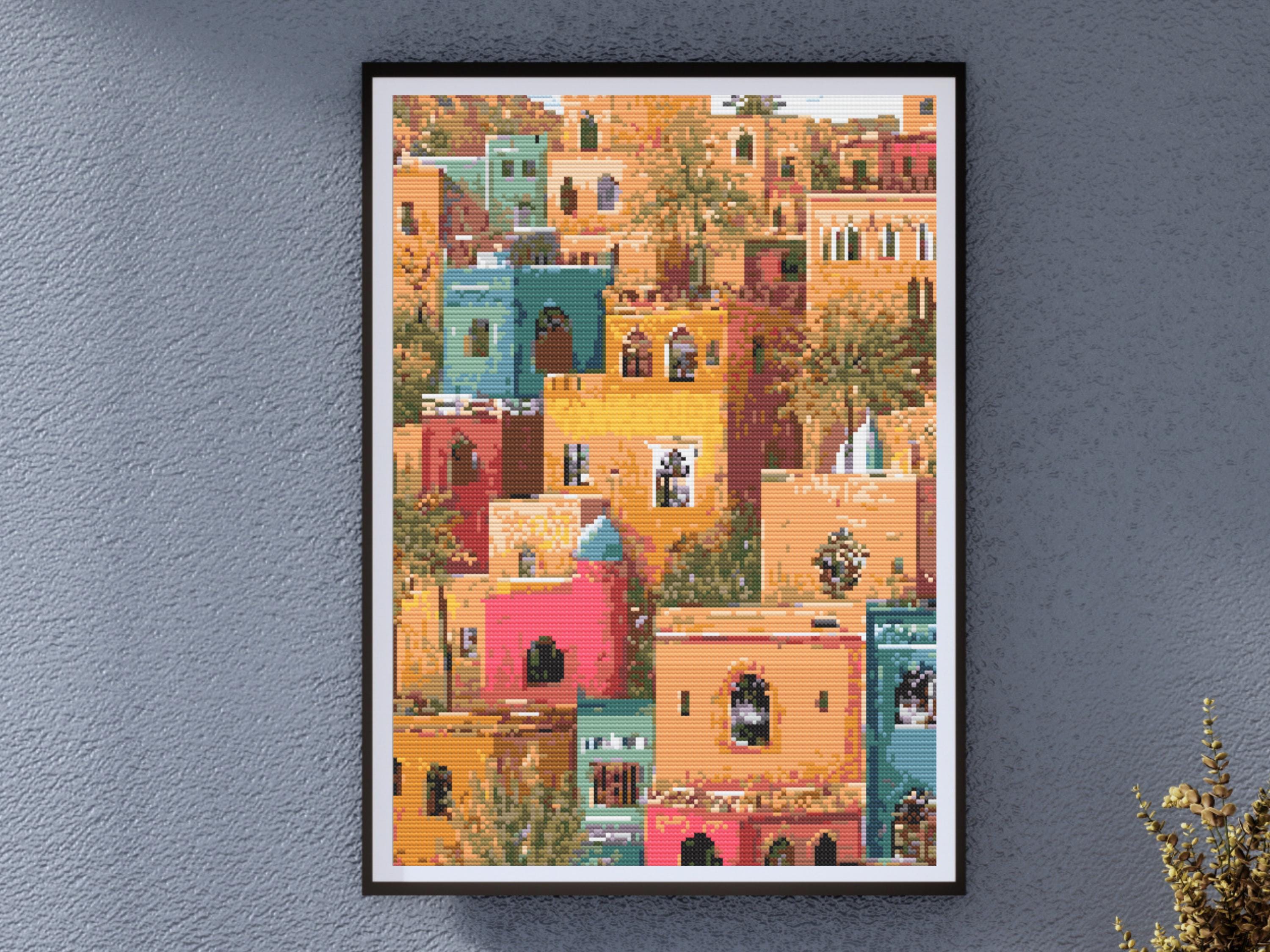 Moroccan City - Colorful Medina Houses in North African Style, No Backstitch Embroidery, Vibrant Urban DIY Wall ArtItem #LTJ-1521