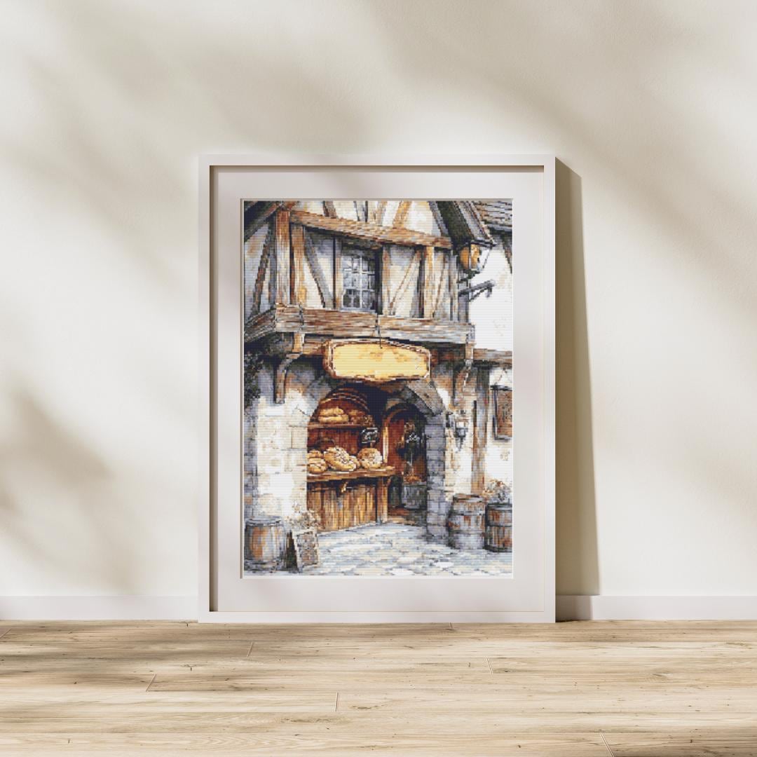 Step into the warmth of a rustic bakery with our Bakery Cross Stitch Pattern - Rustic Village. This charming design showcases an inviting storefront filled with fresh breads, complemented by beautiful wooden textures and aged stone walls. Perfect for those who adore vintage scenes and cozy atmospheres, this cross-stitch pattern adds a touch of Old World charm to your decor. Ideal for cross stitch enthusiasts and those looking to enhance their craft collection. Bring home this delightful boulangerie pattern today and enjoy the artistry of counted cross stitch! Title: Rustic Village Bakery Cross Stitch Pattern - Cozy Old World Charm Description: Step into the warmth of a rustic bakery with this cross-stitch pattern featuring an inviting storefront filled with fresh breads. With beautiful wooden textures, aged stone walls, and barrels for decor, this piece brings the charm of a small-town bakery to life. Perfect for those who love vintage scenes and cozy atmospheres. Pattern Details: Design Area: Approximately 226 x 300 stitches Fabric: 14 Count Aida - 16.25in x 21.50in Stitched image Size 22.25in x 27.50in Suggested fabric size Stitches: Full cross stitches, no backstitching or half stitches Colors Required: 30 Colors: Earthy browns, soft creams, and warm yellows that create a cozy, old-world feel. What's Included: PDF Full-color chart with DMC color codes PDF Black and white chart with DMC color codes PDF File for upload to Pattern Keeper Color SVG Patterns B&W SVG Patterns Why You'll Love This Pattern: Brings a nostalgic, cozy vibe to any room Perfect for kitchen or dining room decor A relaxing project for fans of vintage and country scenes Skill Level: Suitable for all skill levels, from beginners to advanced stitchers Instant Download: Pattern will be available for instant download upon purchase. SOME COMMON CROSS STITCH TERMINOLOGY Aida โ the most popular fabric to use for cross stitch with brands including DMC, Zweigart and Charles Craft. Threads are woven evenly to form squares and the most popular counts are 14 and 16 (see Count below) Back Stitch โ a method of stitching to outline a cross stitch piece, usually in a dark colour. Beads โ can be stitched onto a project to add depth, colour and detail. Blending โ (also called Tweeding) using two or more colours of thread (usually one strand of each) in the same needle at the same time to blend the colours together when stitching. Confetti โ single stitches of different colours looking like little confetti being thrown! Chart โ the cross stitch pattern to work from when stitching. Count โ the number of holes per inch. Often you will hear โ14 countโ meaning 14 holes (or squares) in one inch of the fabric. Counted Cross Stitch โ the fabric is plain and you use a printed or digital pattern as a guide to help you place each stitch. DMC โ one of the most popular brands of thread (or floss) used for embroidery and cross stitch. It comes in hundreds of different colours and effects.