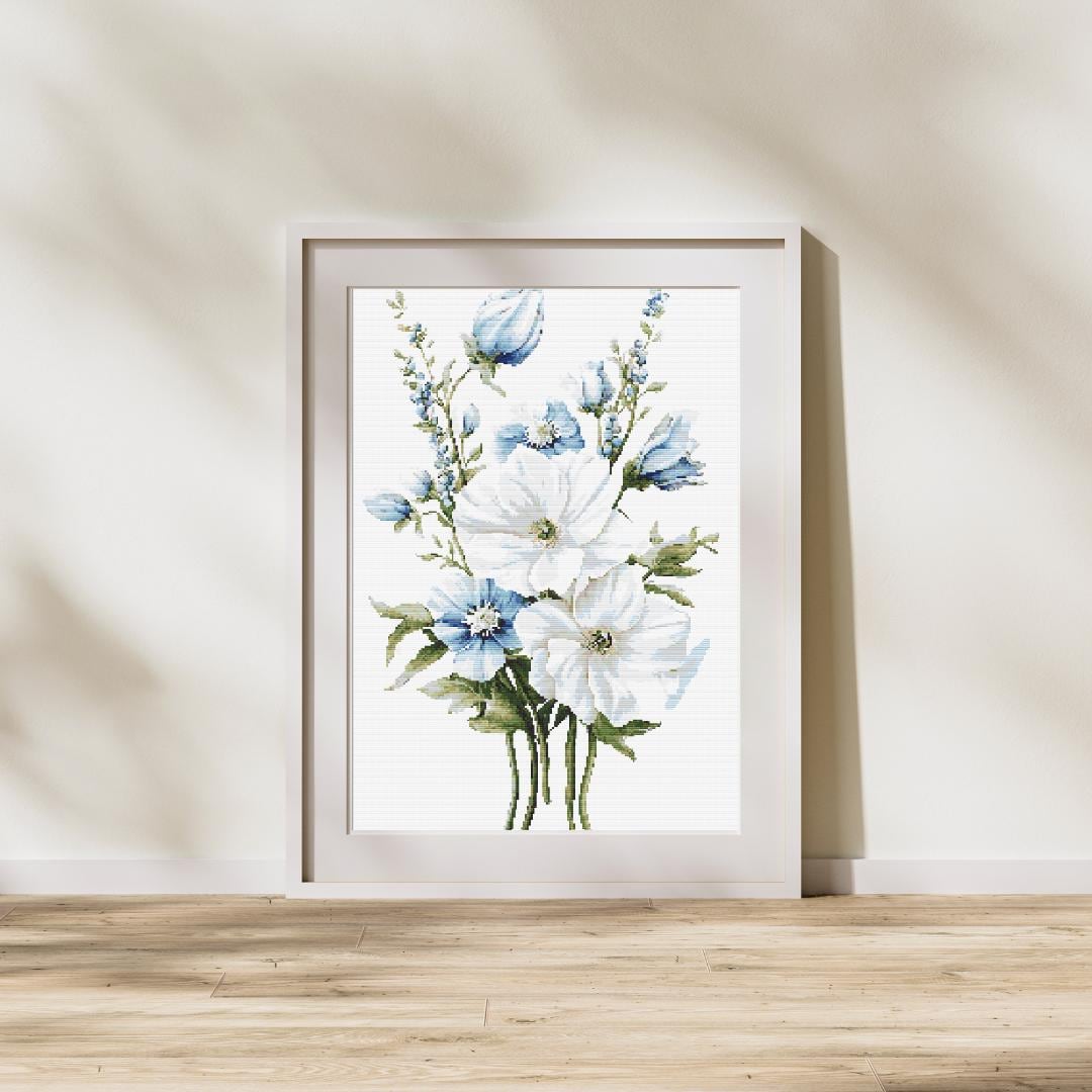 Title: Elegant White and Blue Floral Cross-Stitch Pattern โ Delicate Bouquet Embroidery Design Description: This beautiful cross-stitch pattern captures the elegance of white and blue blooms in a delicate bouquet. The gentle color palette and intricate detailing bring a sense of tranquility and grace, making it a perfect project for floral enthusiasts or as a thoughtful, handcrafted gift. Pattern Details: Design Area: Approximately 200 x 300 Stitches Fabric: 14 Count Aida - 14.25in x 21.50in Stitched Image Size - 20.25in x 27.50in Suggested Fabric Size Stitches: Full cross stitches, no backstitching or half stitches Colors Required: 30 Colors: A soothing combination of soft whites and gentle blues, enhancing the timeless beauty of the floral design. What's Included: PDF Full-color chart with DMC color codes PDF Black and white chart with DMC color codes PDF File for upload to Pattern Keeper Color SVG Patterns B&W SVG Patterns Why You'll Love This Pattern: A serene floral arrangement that adds elegance to any room Ideal for floral cross-stitch lovers and home decor enthusiasts Creates a relaxing stitching experience and a lovely finished piece Skill Level: Suitable for all skill levels, from beginners to advanced stitchers Instant Download: Pattern will be available for instant download upon purchase. SOME COMMON CROSS STITCH TERMINOLOGY Aida โ the most popular fabric to use for cross stitch with brands including DMC, Zweigart and Charles Craft. Threads are woven evenly to form squares and the most popular counts are 14 and 16 (see Count below) Back Stitch โ a method of stitching to outline a cross stitch piece, usually in a dark colour. Beads โ can be stitched onto a project to add depth, colour and detail. Blending โ (also called Tweeding) using two or more colours of thread (usually one strand of each) in the same needle at the same time to blend the colours together when stitching. Confetti โ single stitches of different colours looking like little confetti being thrown! Chart โ the cross stitch pattern to work from when stitching. Count โ the number of holes per inch. Often you will hear โ14 countโ meaning 14 holes (or squares) in one inch of the fabric. Counted Cross Stitch โ the fabric is plain and you use a printed or digital pattern as a guide to help you place each stitch. DMC โ one of the most popular brands of thread (or floss) used for embroidery and cross stitch. It comes in hundreds of different colours and effects.
