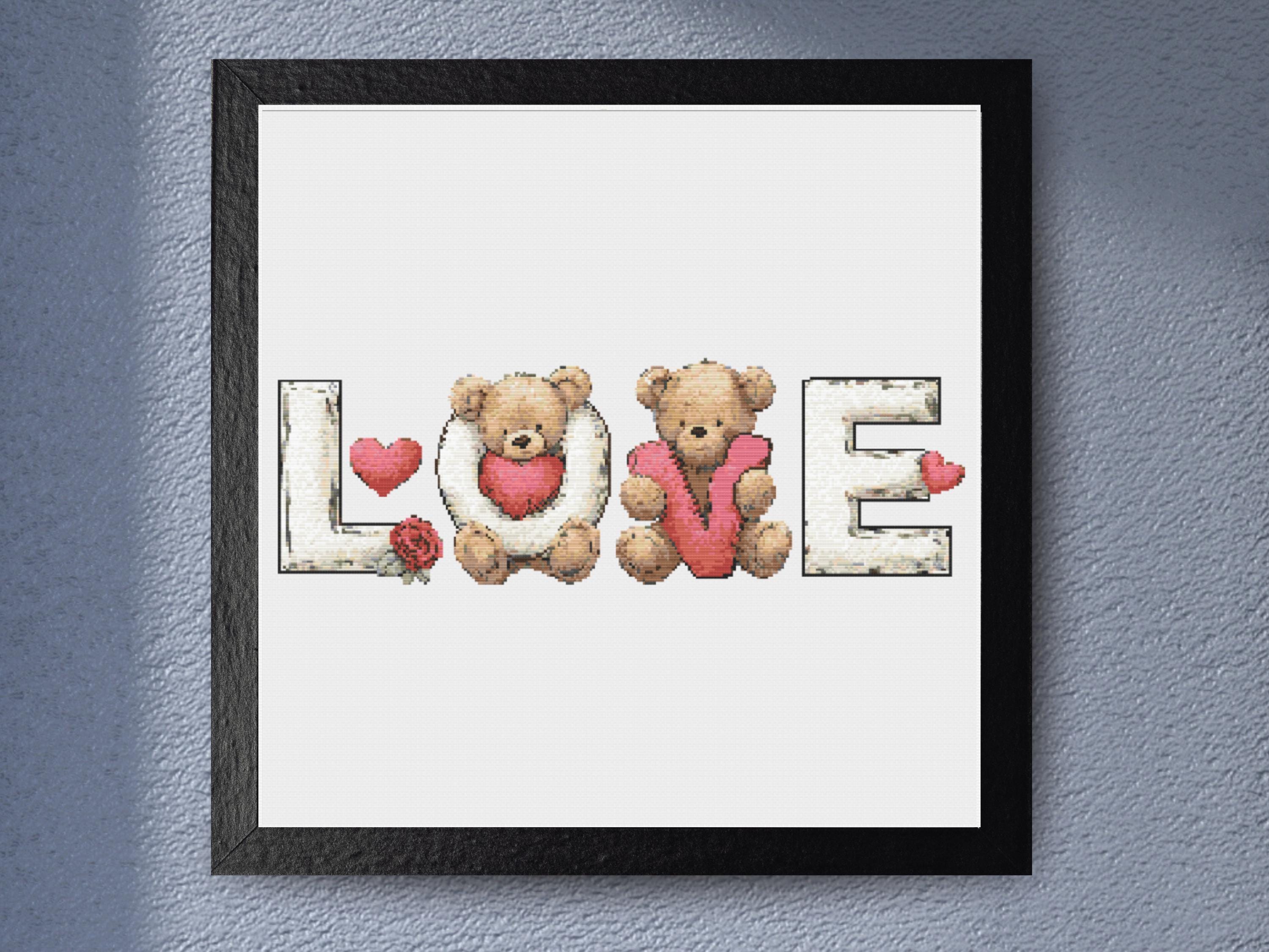 Love Teddy Bear Cross Stitch Pattern with Romantic Hearts and Roses for Valentine’s Day or Homedecor Description Celebrate love with this charming cross stitch pattern featuring two cuddly teddy bears nestled among the letters of the word “LOVE.” Delicately shaded hearts, a classic red rose, and soft wood-textured letters complete the composition — a heartwarming piece perfect for expressing affection. This delightful design evokes sweetness and sentiment, making it an ideal handmade gift for Valentine’s Day, anniversaries, weddings, or baby showers. With its balanced use of warm neutrals and pops of red and pink, this pattern is designed to bring joy and warmth to any room. Whether you're an experienced stitcher or a beginner, this easy-to-follow pattern is designed for all skill levels. The combination of cute characters and meaningful imagery makes this project a heartfelt addition to any craft collection or stitched decor. Pattern Details Design Area: 270 x 90 stitches (19.3 x 6.4 inches on 14-count Aida) Fabric: 14 Count Aida (recommended) but can be stitched on any fabric count of your choice. Just remember to adjust the fabric size and number of threads used accordingly / to your preference. Stitch Types: Full cross stitches only Colors Required: 28 DMC colors Color Palette: Warm neutrals with soft pinks and reds, creating a cozy and affectionate feel What’s Included PDF Full-color chart with DMC color codes PDF Black & white chart with DMC color codes PDF optimized for Pattern Keeper SVG Pattern files in color and black & white Why You’ll Love This Pattern Easy to follow and relaxing to stitch Beautiful as a gift or framed home decor Ideal for nurseries, seasonal gifts, or special occasions Includes multiple chart options for all preferences Skill Level Suitable for all skill levels: beginner, intermediate, and advanced Instant Download This cross stitch pattern PDF is available instantly after purchase via download — no physical product will be shipped. SOME COMMON CROSS STITCH TERMINOLOGY Aida – the most popular fabric to use for cross stitch with brands including DMC, Zweigart and Charles Craft. Threads are woven evenly to form squares and the most popular counts are 14 and 16 (see Count below) Back Stitch – a method of stitching to outline a cross stitch piece, usually in a dark colour. Beads – can be stitched onto a project to add depth, colour and detail. Blending – (also called Tweeding) using two or more colours of thread (usually one strand of each) in the same needle at the same time to blend the colours together when stitching. Confetti – single stitches of different colours looking like little confetti being thrown! Chart – the cross stitch pattern to work from when stitching. Count – the number of holes per inch. Often you will hear ’14 count’ meaning 14 holes (or squares) in one inch of the fabric. Counted Cross Stitch – the fabric is plain and you use a printed or digital pattern as a guide to help you place each stitch. DMC – one of the most popular brands of thread (or floss) used for embroidery and cross stitch. It comes in hundreds of different colours and effects. © Copyright littlethingsbyjoe By purchasing this cross stitch pattern you agree to use these patterns solely for your own crafting projects. Any copying, sharing or selling of the digital files is prohibited.